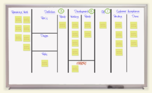 Die verschiedenen Arbeitspakete werden mit einer Priorität versehen, in Spalten einsortiert und wandern dann von links nach rechts, bis sie abgeschlossen sind.